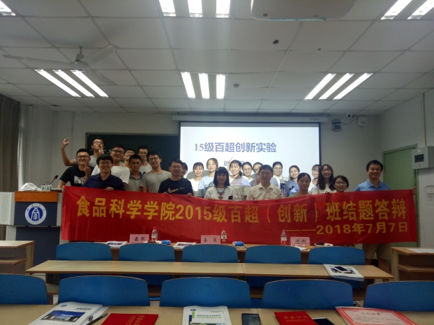 7月7日下午3:00~5:00,食品科学学院2015级百超(创新)班级在32教学楼305、306教室开展了百超“创新项目”结题答辩会。食品科学学院副院长曾凯芳教授、专家组成员曾凡坤教授、索化夷副教授、陶晓奇副教授、叶发银副教授、周韵副教授及班主任邓丽莉老师等出席结题答辩会。