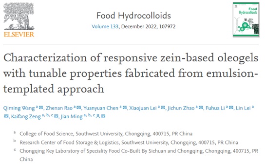 川渝共建特色食品重庆市重点实验室明建教授科研团队在由乳液模板法制备的具有可调特性的玉米醇溶蛋白基油凝胶的表征研究中取得重要进展,研究成果被Food Hydrocolloids国际期刊收录。