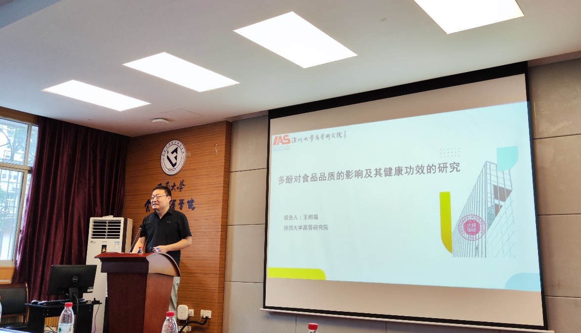 7月25日上午,深圳大学高等研究院王明福教授在食品科学学院39教215学术报告厅作题为“多酚对食品品质的影响及其健康功效的研究”的专题学术报告。本次报告由张宾佳教授主持,学院部分教师骨干及学生代表到场聆听。