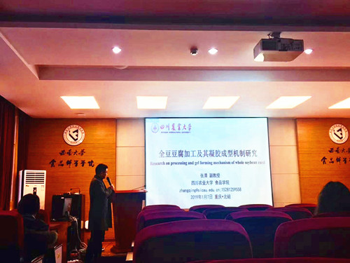 2019年1月7日,四川农业大学的张清副教授应邀在beat365中国唯一官网39教215报告厅作题为“全豆豆腐加工及其凝胶成型机制研究”的专题报告。本次报告由食品科学学院副院长张宇昊教授主持,学院百余名师生参会。