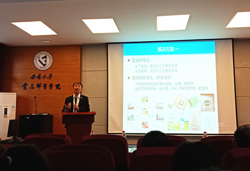 报告会上,金征宇教授首先分享了传统餐饮与现代食品工业的区别与联系,帮助大家树立食品设计师的概念。其次,他提出现代电商、物流、互联网、自动化等技术的发展为餐饮业和现代食品工业的融合提供了最好的契机。最后,金教授提出餐饮业与食品工业的融合能有效促进中餐在全球范围传播,树立优良的中餐形象,提升中华饮食文化在世界范围内的影响力。
