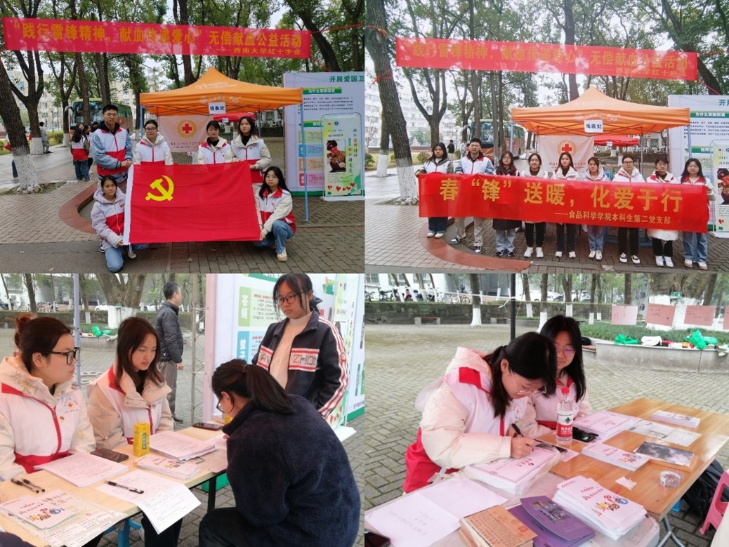 习近平总书记指出“雷锋精神,人人可学;奉献爱心,处处可为。”为弘扬“奉献、友爱、互助、进步”的志愿服务精神,310日,本科生第二党支部协助西南大学红十字会开展以“践行雷锋精神,献血传递爱心”为主题的无偿献血活动。经过培训的党员同志在各自岗位上认真工作,热情服务前来献血的同学。魏丽同志表示,作为一名党员同志,能够积极参与到无偿献血这样的公益活动中,把雷锋精神融入到日常的生活和实践中,非常有意义,在实践中,也对雷锋精神有了更加深刻的认识,更加坚定了自己学雷锋的信念。