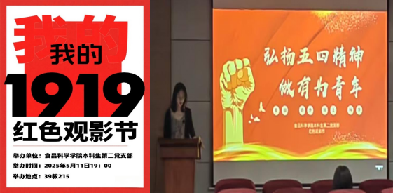为深化党史学习,弘扬五四精神,2025年5月11日,食品科学学院本科生第二党支部在39教215开展“红色观影节——五四精神主题教育”活动,集中观看电影《我的1919》。本科生第二党支部全体党员、入党积极分子及部分团员参与活动,本次活动由耿李加涛同志主持。