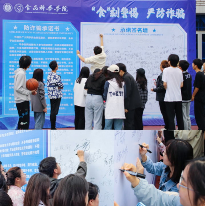 活动现场,食品科学学院全体学生在主持人的带领进行反诈宣誓。整齐站立,右手握拳,他们用铮铮誓言许下预防诈骗的郑重承诺。庄严的誓词和“厚重”的签名承诺仪式感让“‘食’刻警惕,严防诈骗”铭记于心。本次反诈趣味运动会在同学们的誓言中拉开了帷幕。