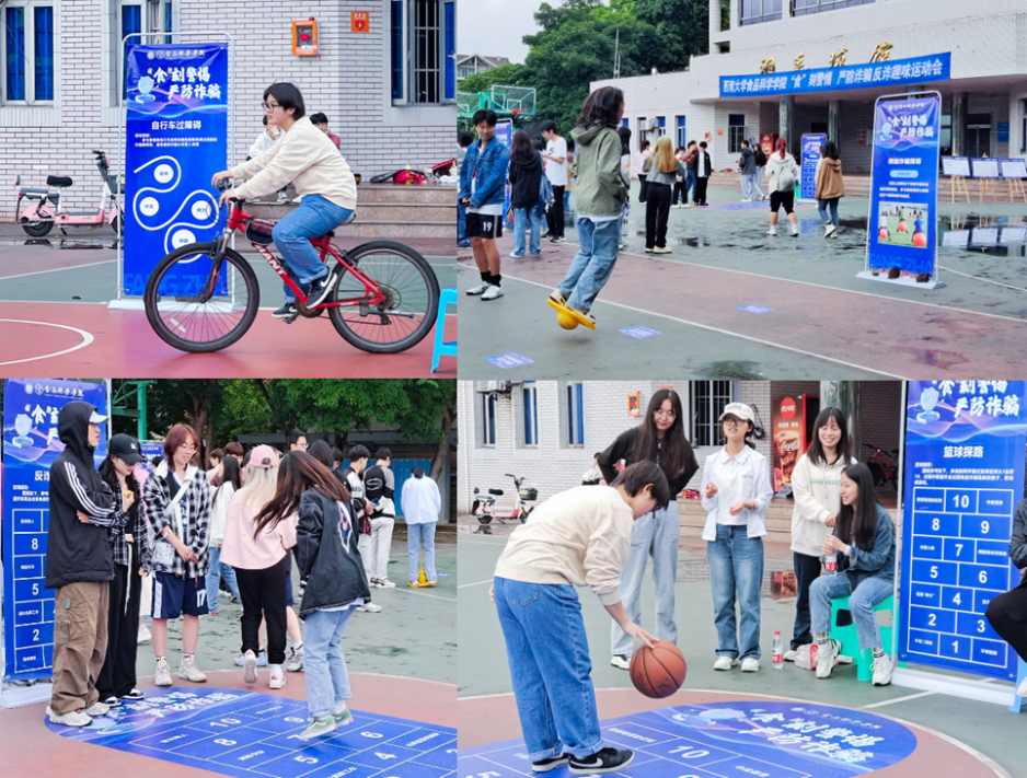 食品科学学院将网贷、刷单、中奖、裸聊等与诈骗有关的词汇做成“反诈跳房子”“自行车过障碍”“反诈沙包”“篮球探路”“呼啦圈问答”“跨越诈骗障碍”“反诈接力”七个趣味游戏,让同学们在玩游戏集章兑奖品的同时了解到 “谎称欠费”“车票机票退改签”“刷卡消费”等诈骗手段和 “校园贷”“免费送皮肤”“刷单兼职”等在大学生中频发的诈骗案件。