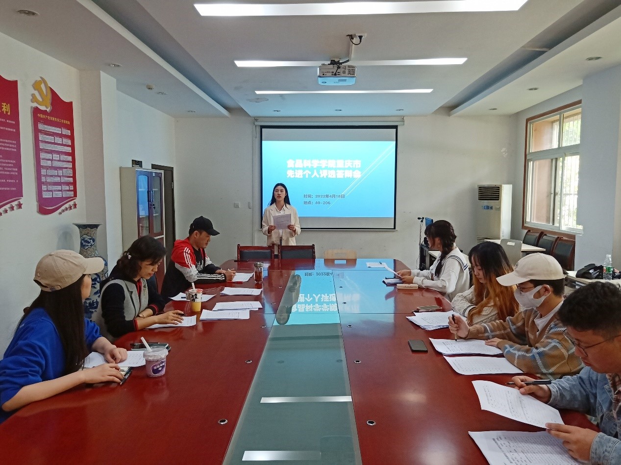 为贯彻落实“学党史、悟思想、办实事、开新局”要求,全面形塑“新学工”格局,激发全院学生学习先进、争先创优的热情,营造优良院风学风,4月18日12点,食品科学学院重庆市高校学生先进评选答辩会在40教206教室举行,学院党委副书记刘秋艳,团委书记黄晔,2020级辅导员杨希,2021级辅导员夏雪以及各年级学生骨干出席本次会议,夏雪担任主持人。