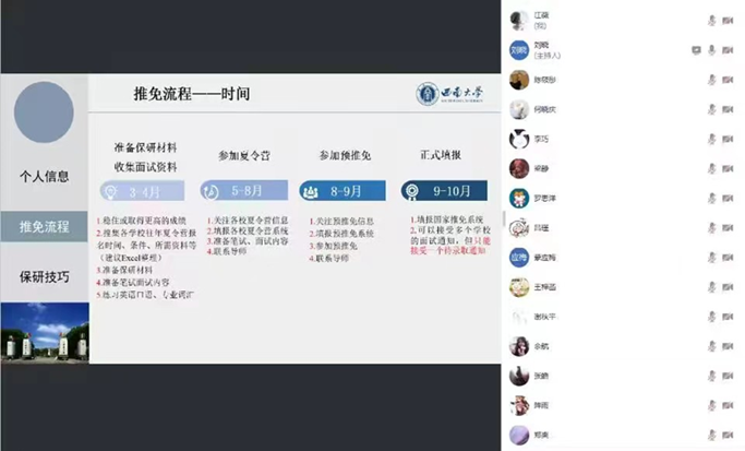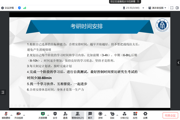 在食品质量与安全专业分享会上,2019级本科毕业生刘晓分享了多所院校夏令营的申请经验、保研时间线和择校对比等内容。2019级本科毕业生陈筱彤和陈亚芳则围绕考研详细介绍了择校、备考、复试等流程中的注意事项。此外,2019级本科毕业生周宏悉心讲授了企业求职的面试技巧,补充分享了如何充分利用资源平台实现高质量就业的内容。2020级本科生吴桂英分享了公务员备考经验,就如何选择报考单位和岗位、备考计划、笔试内容及面试技巧等内容进行了耐心讲解。