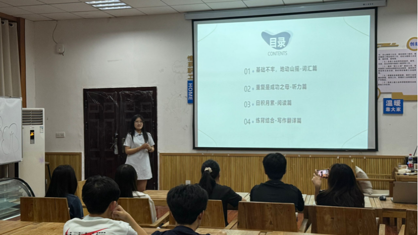为助力同学们提升英语水平,顺利通过英语四六级考试,5月17日“食”佳学霸朋辈帮扶学业加油站——英语四六级专场在39教214顺利开展。本次活动特邀本科生丁雨萌和唐艺源前来分享,食品科学学院大一学生参与学习交流。