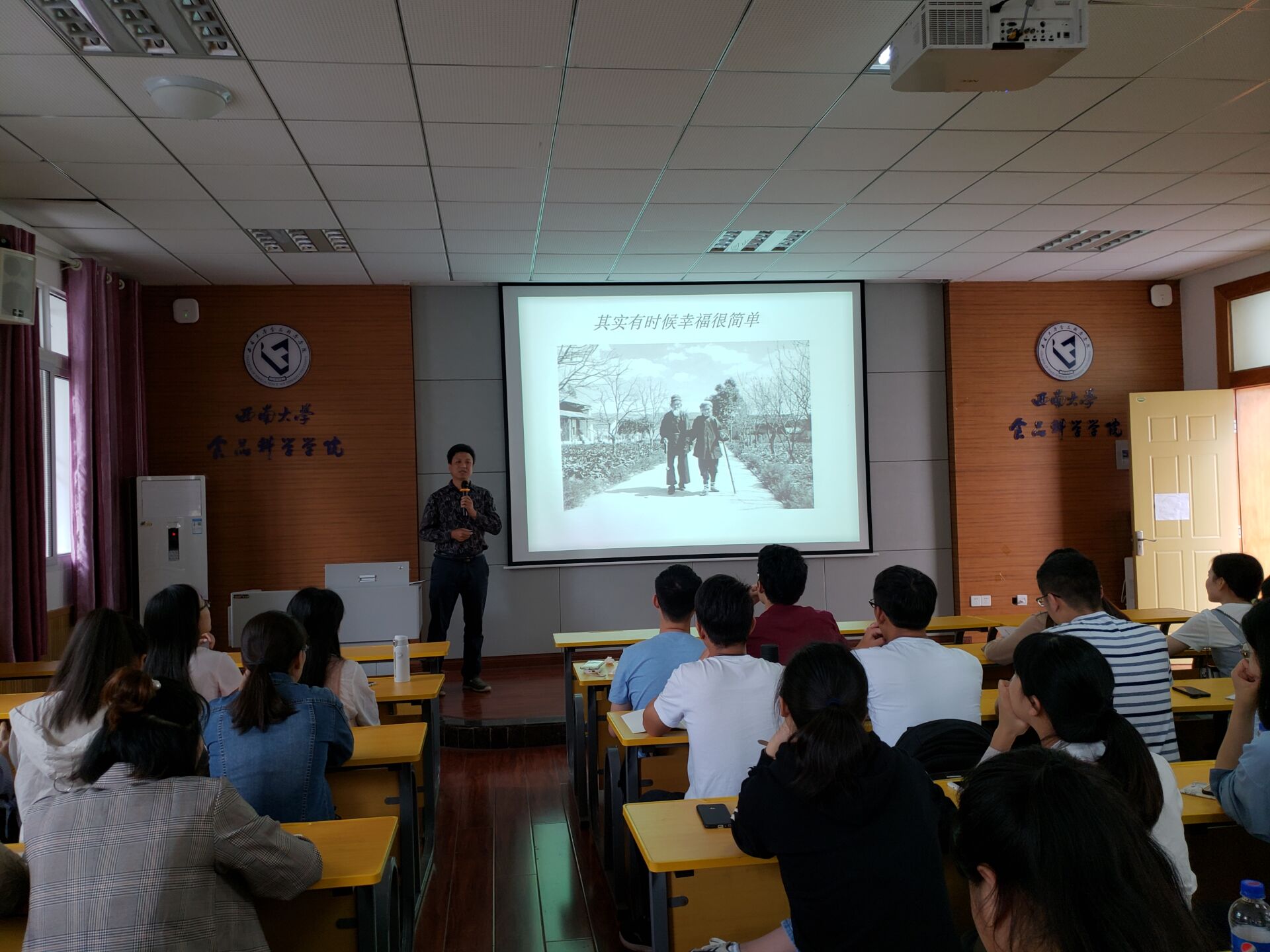 讲座伊始,周书记通过一系列温馨有爱的图片论证幸福其实很简单。随后切入主题,人要正确认识自己,做到身体、心理健康,真面人性,通过穿插讲述的真实的小故事,深入浅地进行了详细讲解,并以幽默的口吻迎来了同学们的阵阵欢笑声与掌声。