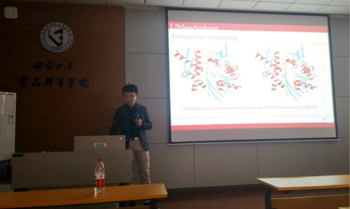 报告伊始,张宇昊教授简要介绍了高子立博士的学习经历和从事的学术研究。随后,高博士对Nobiletin进行了介绍,阐明Nobiletin及其代谢产物对癌细胞中靶蛋白的抑制作用和机理,并将其与即将上市的抗癌药物17AAG进行对比,展示了Nobiletin及其代谢产物良好的抗癌效果和协同作用。最后,高博士感谢母校和恩师的支持,同时也向在座研究生提出期望,“希望学弟学妹们能走出去看看,努力认真学习,为西大争光”。