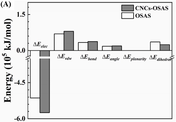 图4各项相互作用能对纤维素纳米晶与淀粉酯结合过程的贡献(A)和MD模拟中淀粉酯与淀粉酯、纤维素纳米晶与淀粉酯之间的氢键数目(B)