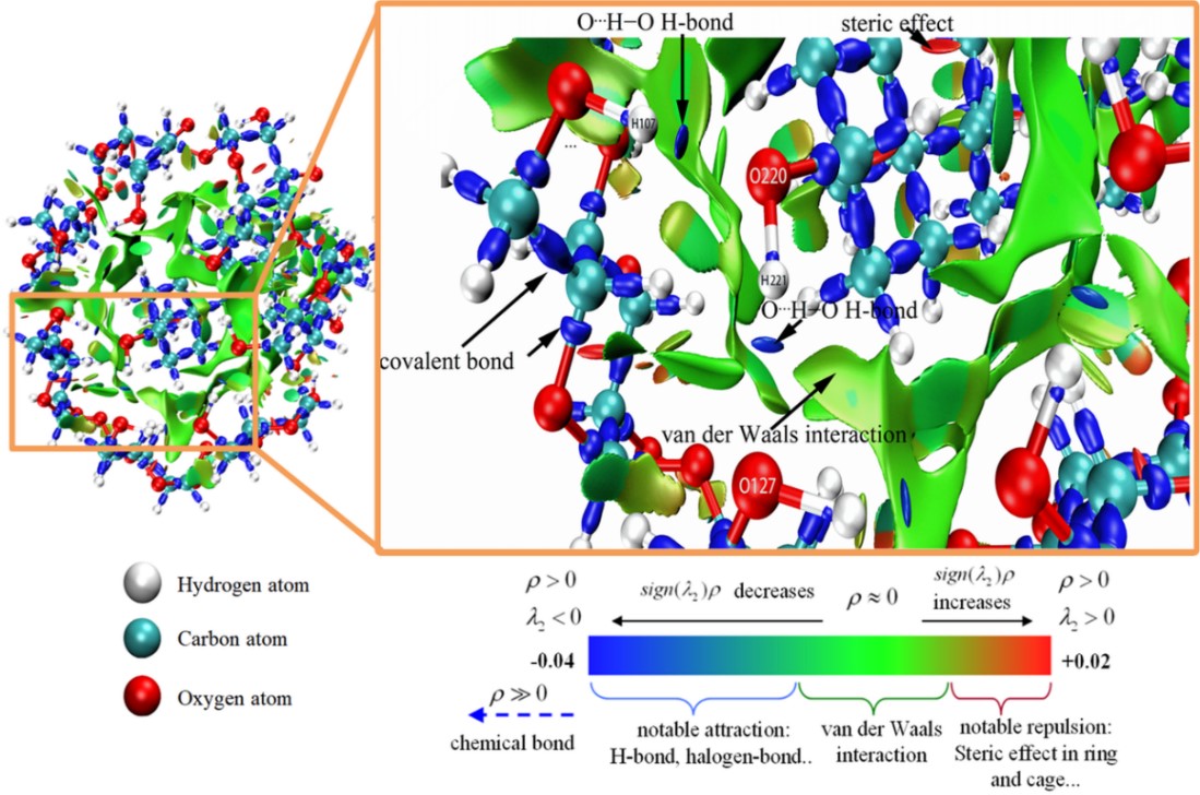 此外,富含不饱和脂肪酸的油脂存在水溶性差、生物利用率缺点,通过纳米技术获得功能性油脂纳米乳液是提高油脂生物利用度的有效途径之一。通过理论计算研究组分之间的相互作用,为从分子水平阐明乳液的形成与稳定机理提供理论支撑,相关成果发表在国际期刊LWT-Food Science and Technology。结果表明,当纤维素纳米晶与淀粉酯(质量比为2∶8)和亚麻籽油的浓度分别为1.5 wt%和10 wt%时,形成相对稳定的Pickering乳液。较强的分子间相互作用(静电作用)有利于形成更稳定的纤维素纳米晶-淀粉酯复合物。这种相互作用可能对以纤维素纳米晶为稳定剂和淀粉酯为乳化剂制备的Pickering乳液的稳定性有一定贡献。