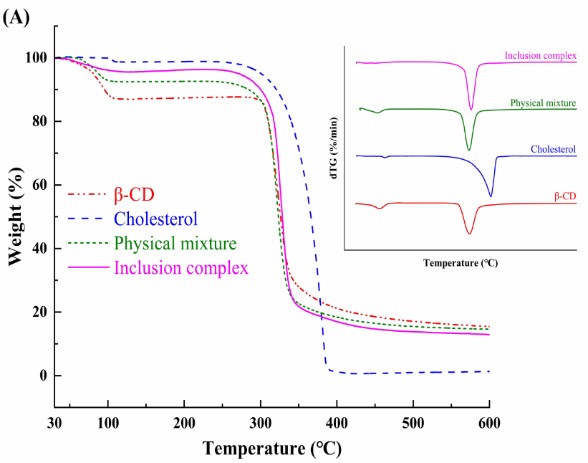 图1 β-环糊精、胆固醇、物理混合物和胆固醇-β-环糊精包合物的TG/DTG曲线(A)和DSC曲线(B)