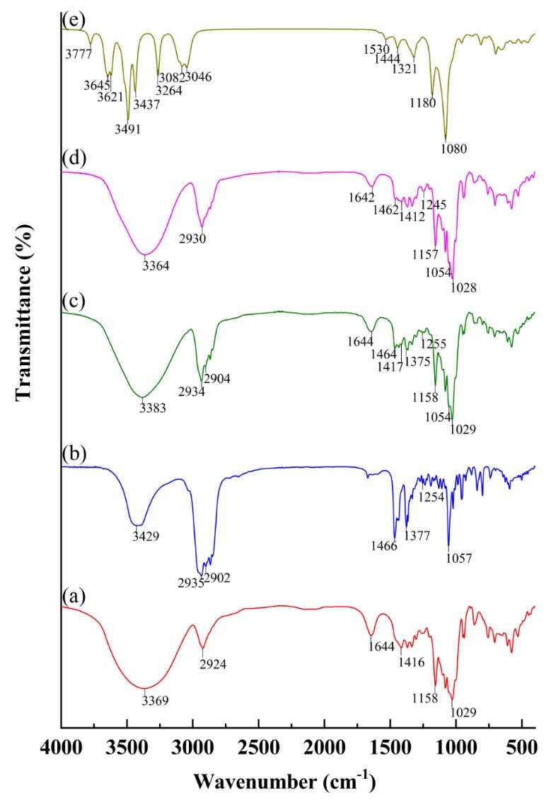 图2 β-环糊精(a)、胆固醇(b)、物理混合物(c)、包合物(d)、最稳定构象的理论红外光谱(e)