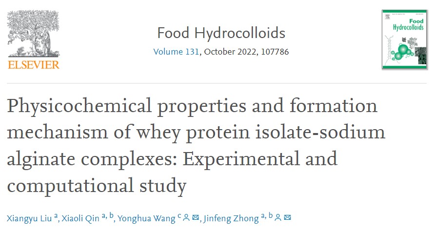 川渝共建特色食品重庆市重点实验室,beat365中国唯一官网钟金锋博士近期在食品领域国际知名期刊《Food Hydrocolloids》(IF=9.147)在线发表了题为“Physicochemical properties and formation mechanism of whey protein isolate-sodium alginate complexes: Experimental and computational study”的研究论文,2019级硕士生刘祥雨为第一作者,西南大学覃小丽副教授、华南理工大学王永华教授参与了本研究的部分工作。