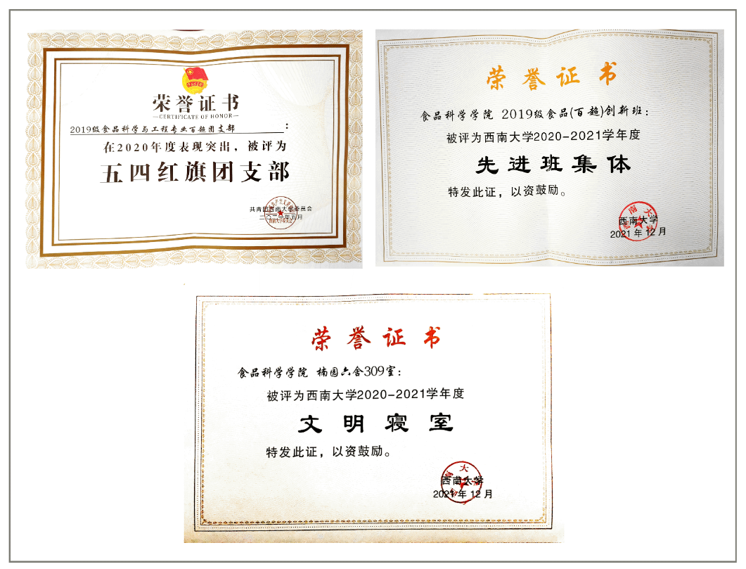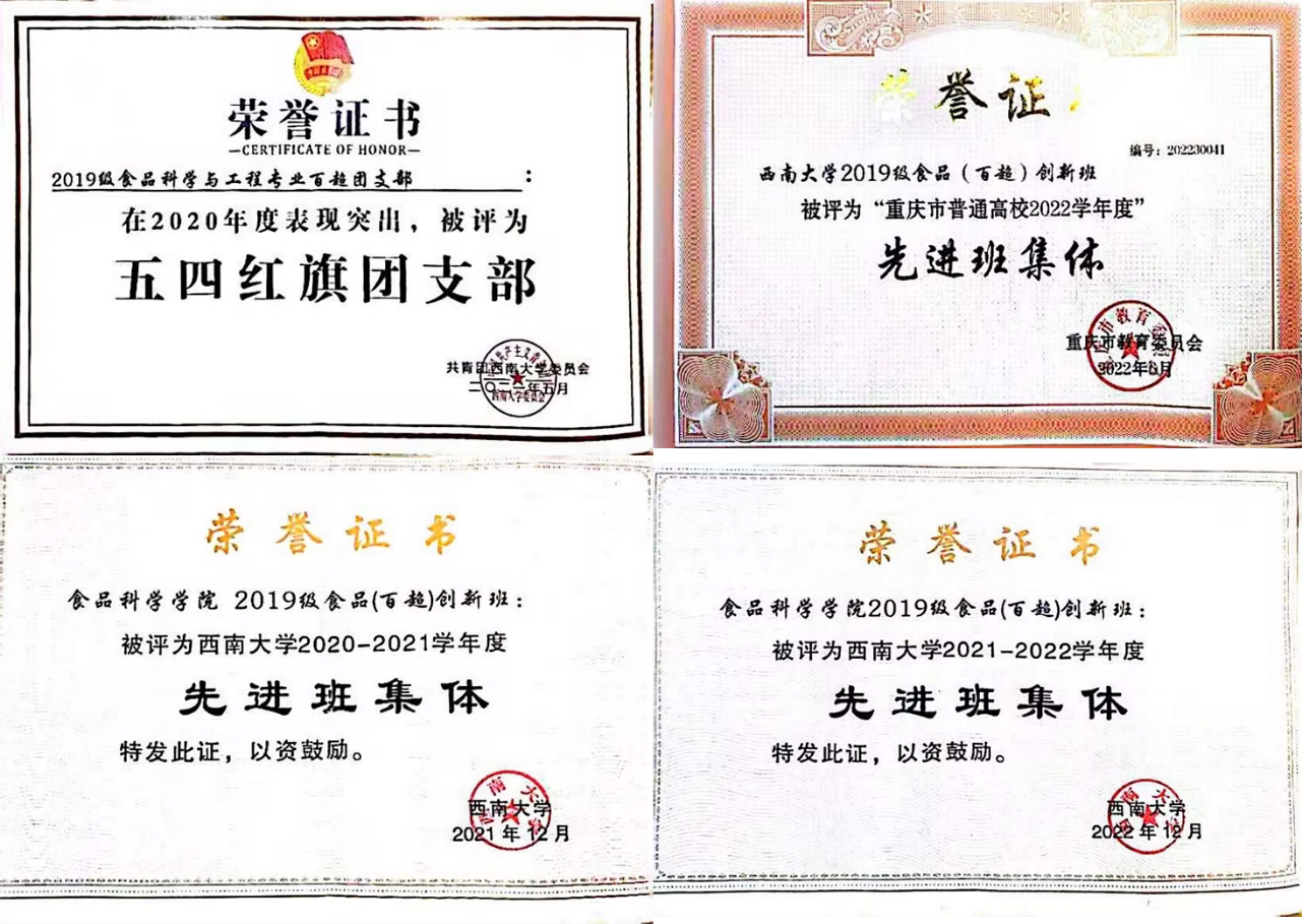 “百超”创新实验班的学生团结友爱,积极阳光,获得了4项集体荣誉。其中,荣获重庆市先进班集体1次、五四红旗团支部1次,西南大学先进班集体2次,充分体现了“百超”创新实验班的团体实力。