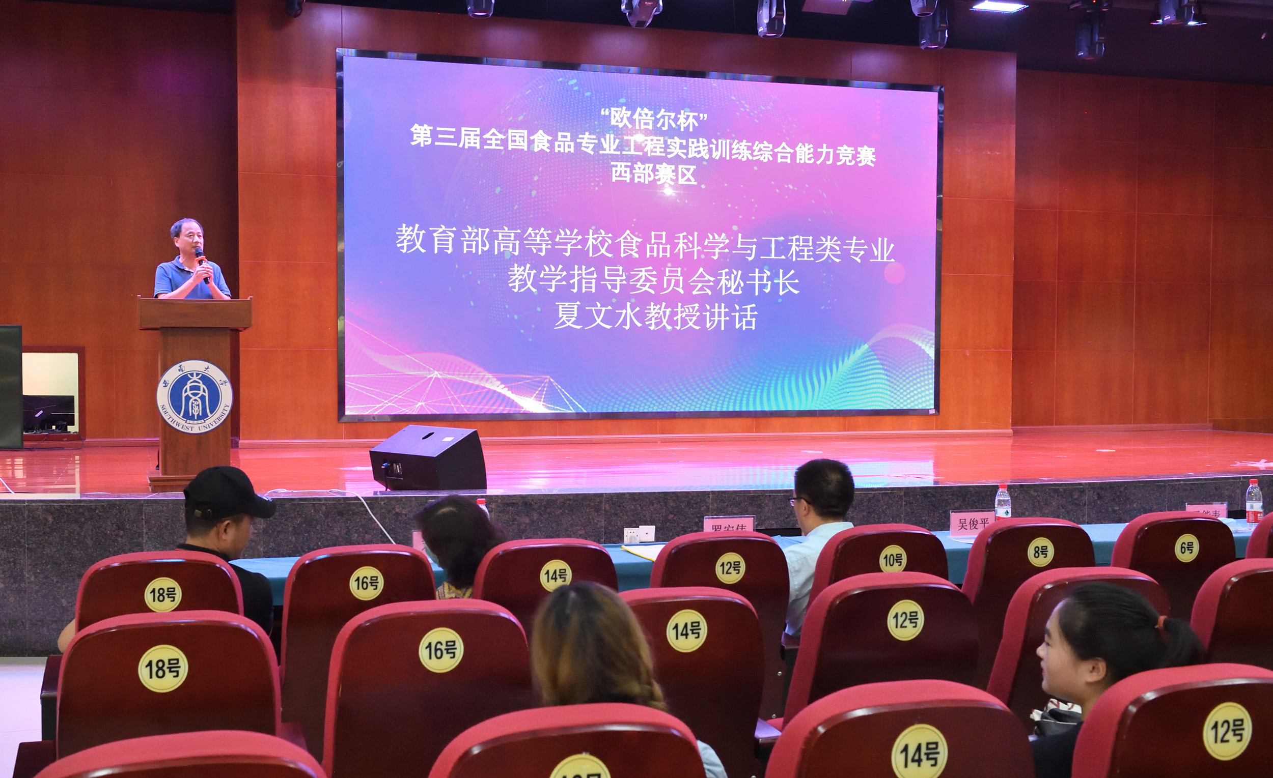 教育部高等学校食品科学与工程类专业教学指导委员会秘书长江南大学夏文水教授,学校教务处吴能表处长、食品学科相关负责人出席开幕式。食品科学学院党委书记吴俊平主持开幕式。吴能表致欢迎辞,介绍了西南大学的本科教学情况以及在实践教学上的特色举措。夏文水代表教指委作了讲话,强调了本次竞赛的目的和任务,期望通过实践引领创新、以创新带动食品学科教育发展。食品科学学院院长张宇昊介绍了学院基本情况,希望通过竞赛推进本科的实践教学改革和创新创业教育。