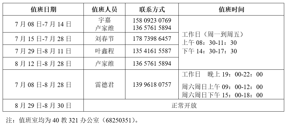 为保障暑假期间师生有序开展实验活动,食品科学学院仪器设备共享服务平台及教学实验室正常开放。值班安排如下:
